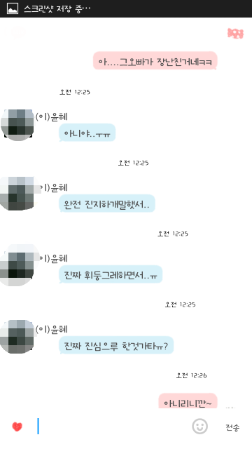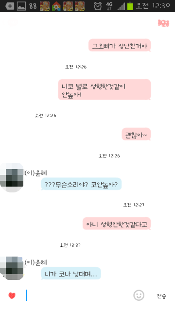 아..ㅎㅎ 절대아니야! 니 코 성형안한것같애ㅎㅎ 성형했는데 그렇게 낮으면 안되징!ㅎㅎ 쌍수도 한것치고는 진짜루 티안나! 오빠한테말해! 쌍수 한번밖에 안했다궁..ㅎㅎ 그냥 그오빠가 장난친거니까~ 너 코도 눈도 안한것같애! 그게 한거면 성형외과의사 고소미 먹여야지 이 개썅년아ㅡㅡ