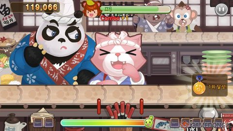 '리듬타고 냠냠냠' 은 팬더 요리사가 보내는 회전 초밥을 타이밍 맞게 잡아서 먹는 방식