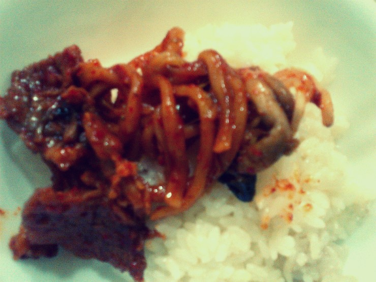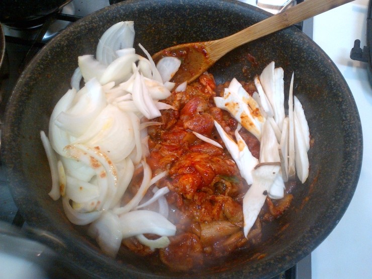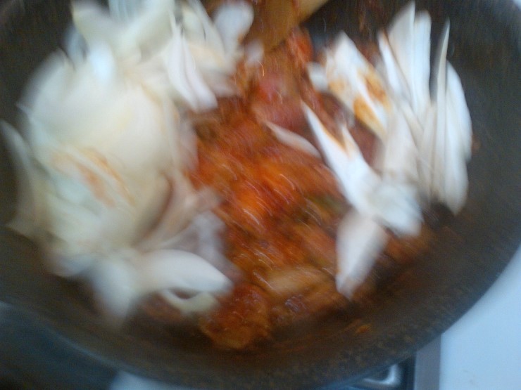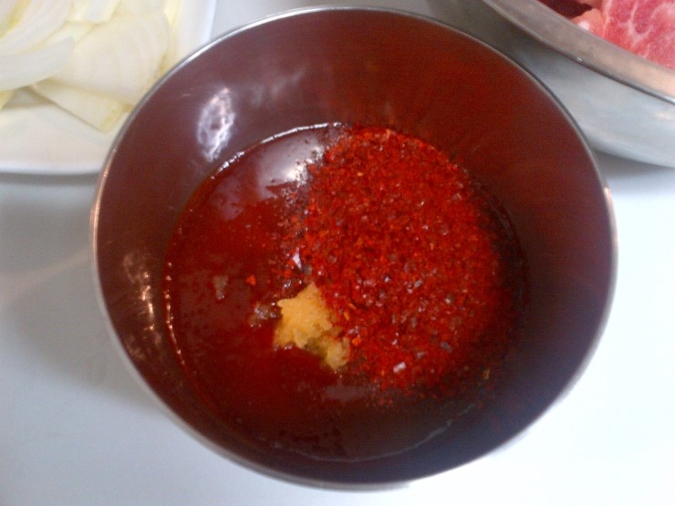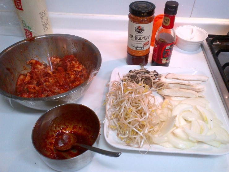 양념 : 고추장 2스푼, 고추가루 2스푼, 돼지불고기 쏘스 반통!, 다진마늘 (불고기소스가 달아서 설탕은 아예 안넣었어요)