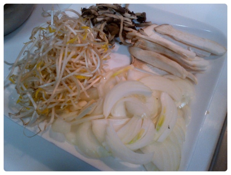 불고기용 돼지고기 한근, 나뒹굴던 조금남은 버섯들(느타리,새송이), 양파 한개, 아삭아삭한 숙주나물
