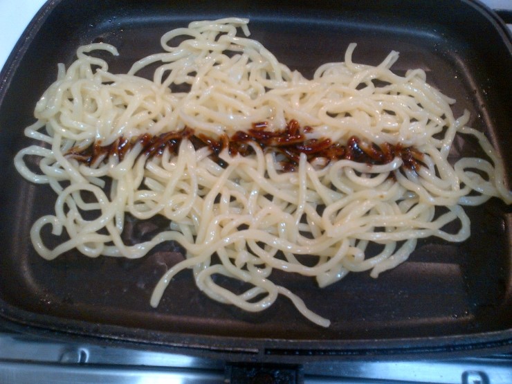 잘 볶아준 면을 고기펜에 넣어서 1분정도 볶아줬어요.