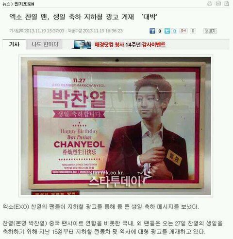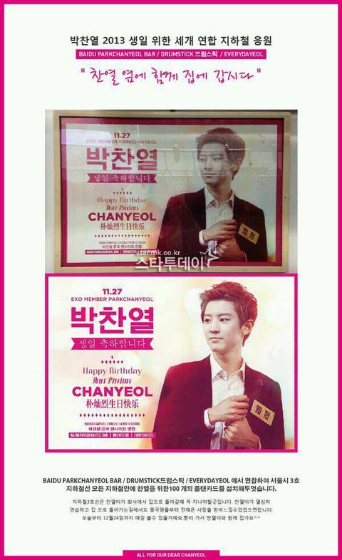 서울 3호선 모든 역에 찬열이 생일 축하광고 설치됨
