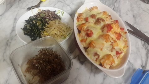 삼색나물과 떡갈비 떡 치즈볶음~~맛이 완전 굿이였다는 ^^