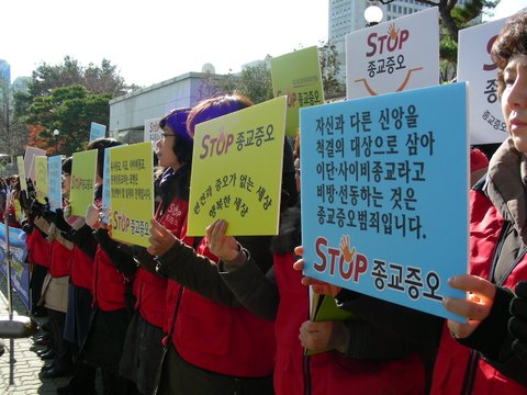 STOP종교증오 회원이 ‘자신과 다른 신앙을 척결의 대상으로 삼아 이단·사이비종교라고 비방·선동하는 것은 종교증오범죄입니다.’라는 손피켓을 들고 있다. 2013.11.20.