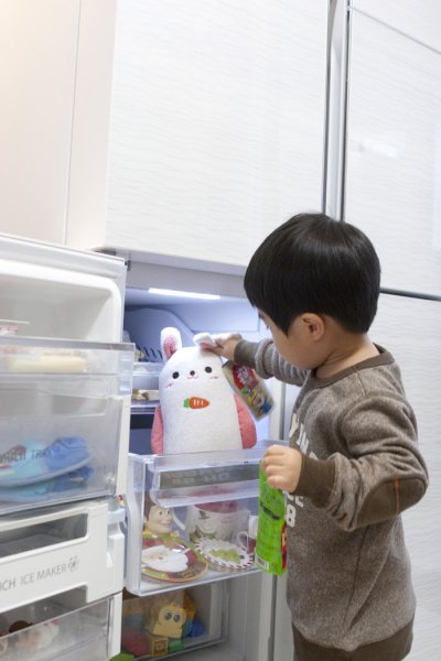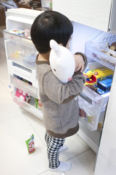 새로산 냉장고에 엄마가 음식 넣는 걸 보더니