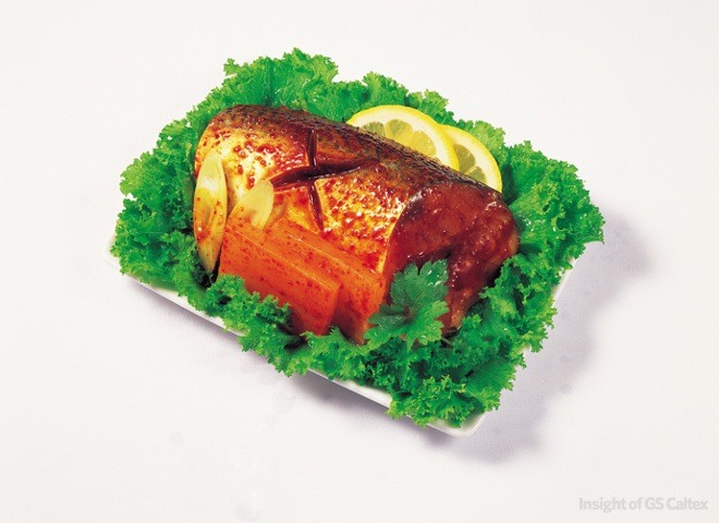 무 위에 바르듯이 올리고 코다리를 그 위에 올린 뒤 나머지 양념을 코다리 위에 모두 발라놓는다.