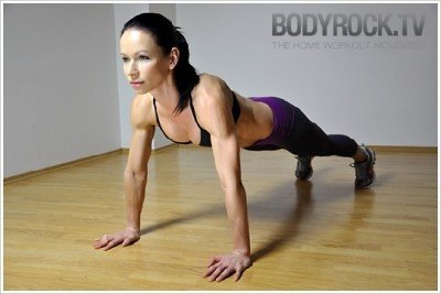 1. 팔을 어깨너비 혹은 그보다 넓게 넓히고, 손바닥을 땅에 대고 엎드린 채 팔 굽혀펴기 자세를 취한다.