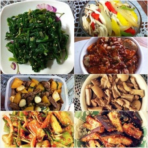각종 반찬종류~ 시금치무침, 버섯볶음, 굴무침, 장조림(소고기, 돼지고기), 오이무침, 가지나물