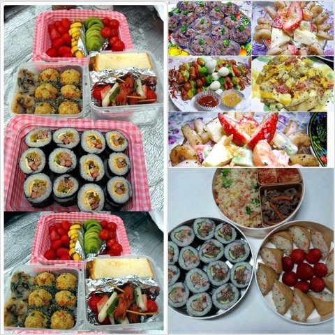 왼쪽은 겹쳐졌네용..ㅠㅠ 친구들과 소풍때 싸갔던 김밥, 과일, 꼬마전, 카레볶음밥(주먹밥), 샌드위치, 그리고 꼬치..
