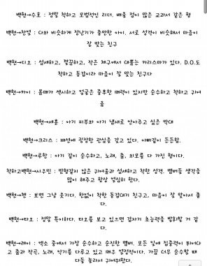 이거보면알겠지만다른멤버들은착하다깔끔하다분위기메이커다이런식으로짧게썻는데백현이만유독길게씀이런거보면알지않아?얼마나속깊고애가배려도많은데그거가지고너무까지않았으면좋겠어내가이글쓰는이유는자꾸아무것도아닌거가지고애까지말라는거야제발ㅠㅠㅠㅠㅠ말투가기분나빳다면미안해ㅠㅠㅠㅠㅠㅠㅠ우리엑소쇼얼마안남았는데진짜ㅏ리얼리티좀편하게보자ㅜㅜㅜㅜㅜ궁예질하지말고ㅠㅠㅠㅠㅠ