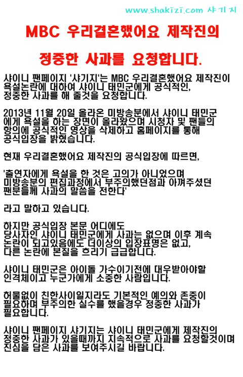 그리고 샤이니 팬들보다는 지금 샤이니의 이태민에게 더 미안하다고 사과하는 게 맞음.