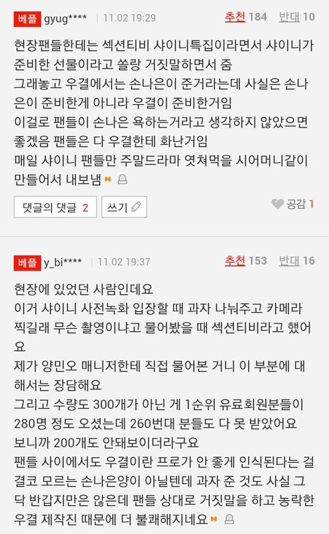 → 당시 팬들이 이것에 대해 해명하자 우결 제작진의 왈 " 샤이니 팬분들이 나은양이 준 걸 알면 안 먹고 버릴까봐 그랬다"