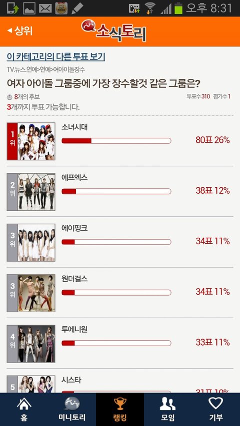 지금 투표하는 데서 가장 장수할 것 같은 여자 아이돌 그룹 하고 있는데 우리 지금 3위입니다 ㅜㅜ