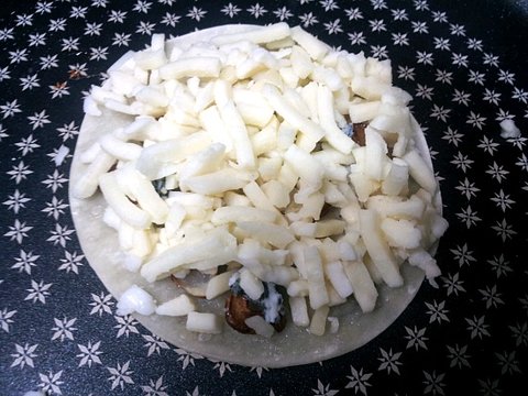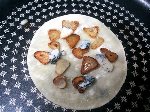 다른 만두피에 구운 마늘을 올리고 고르곤 졸라 치즈를 살짝 올려줍니다.