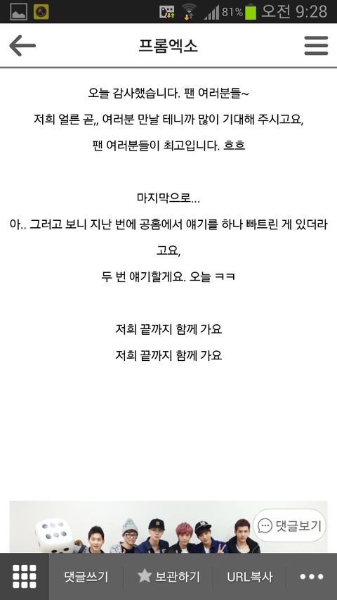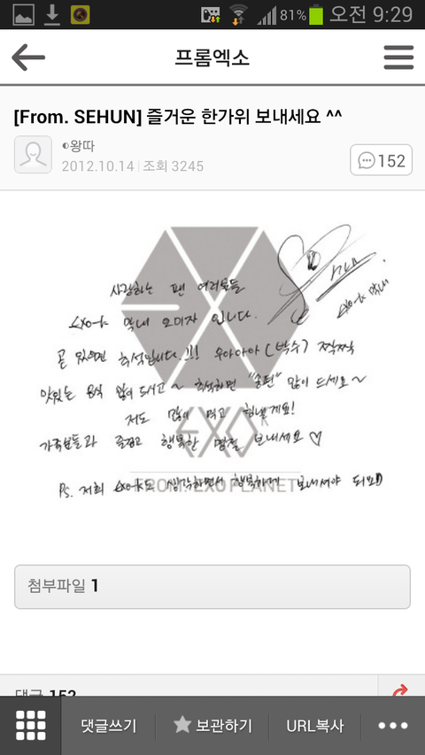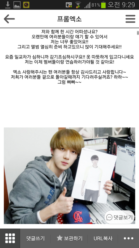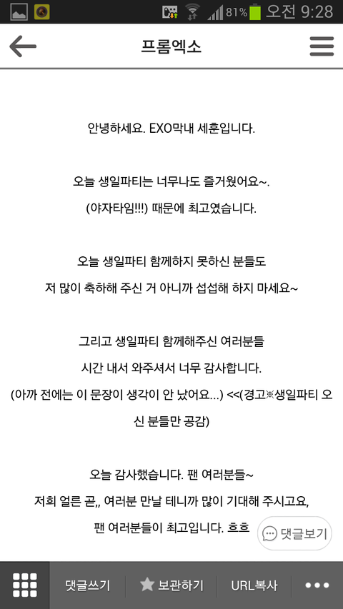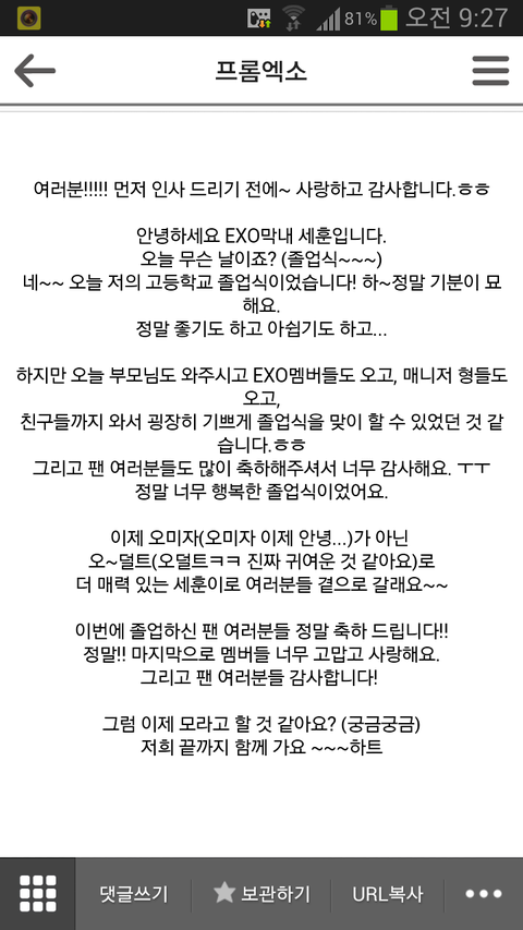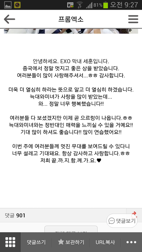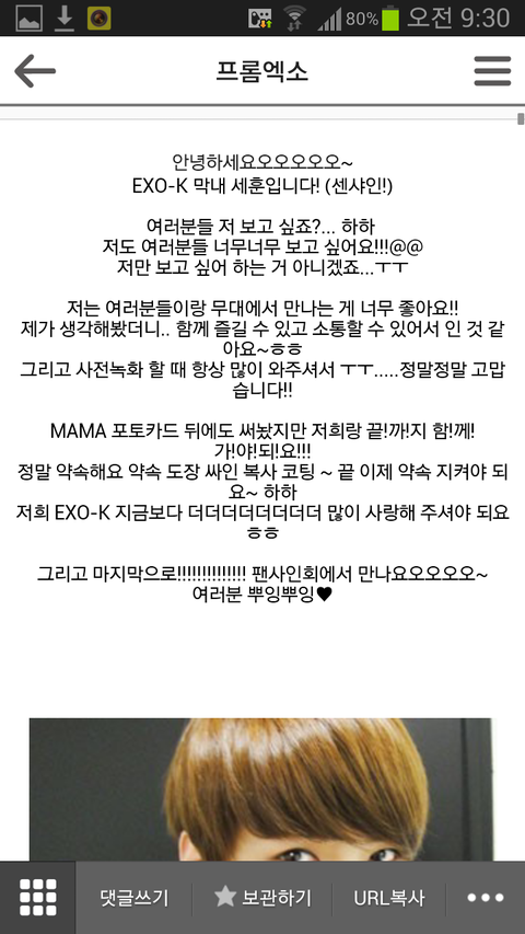 오세훈이 여태올린 공홈글들엔 항상 함께하자 사랑한다 고맙다는 팬들에대한 애정가득한 말들이 많음