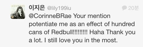아이유 : 어머나 언니 멘션이 레드불 백캔 먹은것만큼이나 힘이 돼요!! 짱 고마움!! 나 여전히 세상에서 언니가 제일 좋아!!