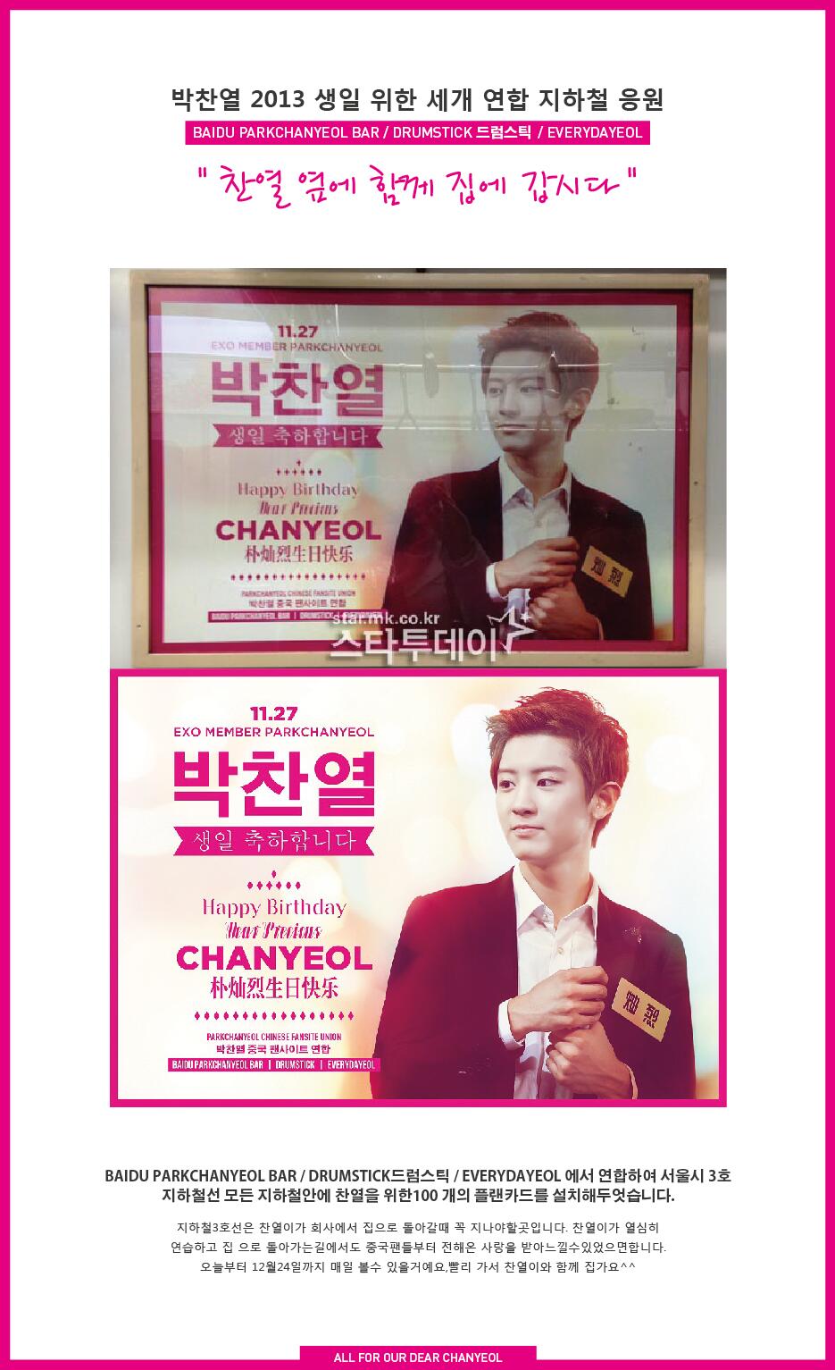 서울시 3호선 모든 지하철안에 찬열 생일 광고 100개 설치