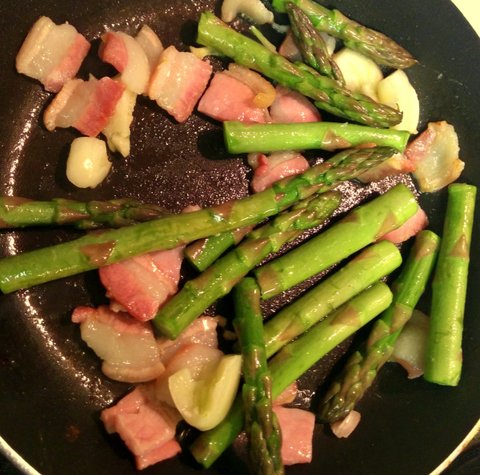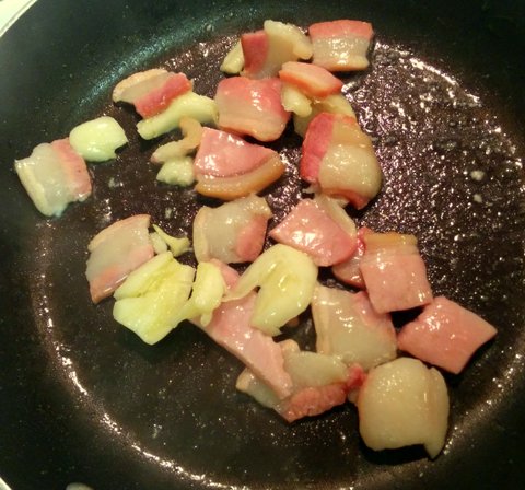 중간불에 올리브유 살짝 두르고 마늘 볶다가 베이컨 투입