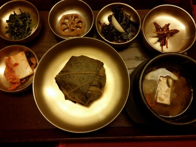 배추김치 / 들깨 취나물 / 연근조림 / 미역무침 / 멸치조림 / 된장국 / 연입밥