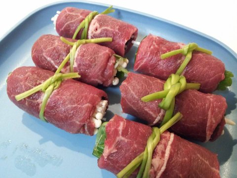 그냥 부채살에 밑간하고, 깻잎이랑 팽이버섯넣고 말아서 미나리로 묶은거예요. 그리고 간장소스에 떡이랑 같이 넣어서 살짝 조려내면.. 맛있더라고요!