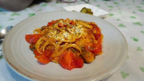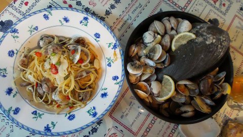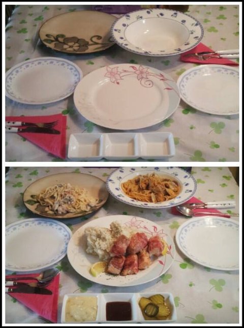 어느 날 친구를 초대해서 식사대접을 했는데 그 친구가 이렇게 찍어서.. 특별한 연출을 했네요ㅋㅋ 핫봉골레+크림파스타 / 스테이크소스와 홈메이드 갈릭마요소스를 곁들인 연어스테이크, 매쉬드 포테이토
