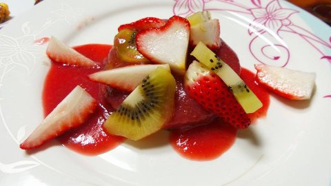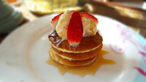 금방 만든 딸기시럽을 듬뿍 뿌린 핫케잌