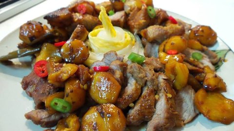 전날 집에서 김장하면서 엄마께서 수육을 삶아주셨는데, 그거 삶고 남은 고깃덩어리가 있길래 그걸로 조림을 만들어봤어요! 밤을 정말 많이넣었더니 밤 향기가 싹 올라오는데.. 맛있었어요.