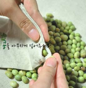 천(헝겁)주머니에 콩(보리, 쌀도 가능해요)을 넣어 전자레인지에 돌려주면 완성.
