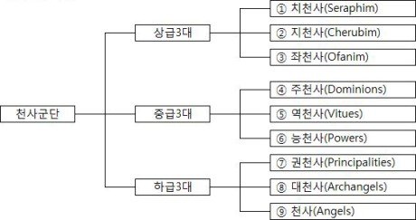 12~13세기에, 신학자들은 각종 자료를 바탕으로 하여 천사들의 순위를 매겼다. 물론 이러한 순위에 대해서는 다른 견해가 있으며, 군단의 지휘관이 누구인지에 대한 의견 또한 다르다. 또한 이 아홉 계급은 7층 혹은 9층으로 되어 있는 천계와는 다르다. 단지 신을 중심으로 한 천사군단의 조직도(組織圖)로 이해해야 할 것이다. 이들 천사들은 소속되는 계급이 높을수록, 즉 신과 가까운 계급일수록 빛이나 불 또는 바이브레이션(진동)과 비슷한 존재이며, 신의 옥좌에서 멀어짐에 따라 육체적인 실체를 갖게 되는 경향이 있다. 그렇지만 천사들이 우리 인간과는 다른 영적 실체를 가진 존재임에는 틀림없다.