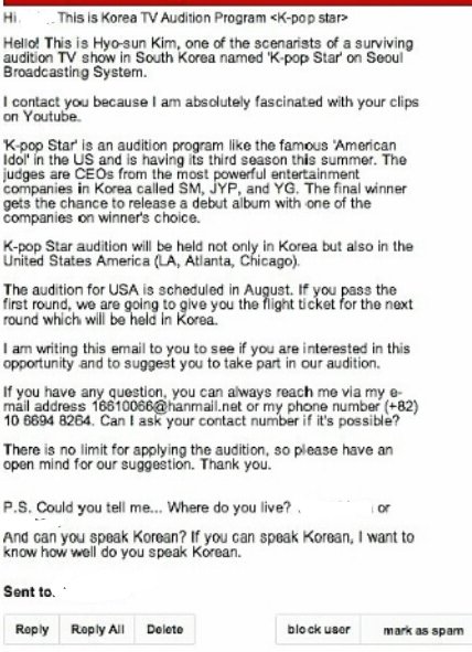 저는 노래가 취미입니다. 그래서 youtube의 비디오도 자주 올려요!근데 어느날 이메일이 왔어요