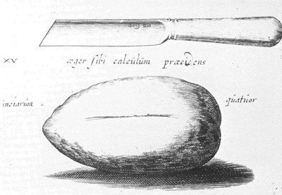 이 용감한 대장장이는 형제의 도움만을 빌어서 직접 자신의 회음부(!)를 절개하여 돌이 나올 수 있도록 상처를 계속 넓혔다고 합니다.결석이 쉽게 나오지 않자 결국 두 손가락을 상처로 집어넣어 돌을 빼내야 했는데 결석이 어찌나 컸던지 방광까지 함께 찢어져 버렸다고..실제로 그의 몸 속에 있던 결석의 크기는 무려 계란의 크기와 같았다고 합니다.