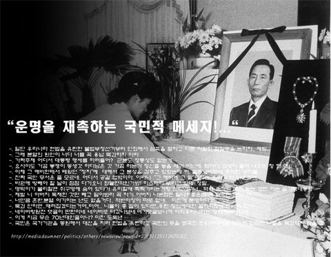 아무튼 박근혜가 겁도 없이 자살골과 다름없는 대국민 협박성 발언을 계속할 경우, 운명의 배후는 국정원의 댓글사건이 원흉으로 작용할 개연성이 매우 짙어 보인다. 비록 우격다짐으로 청와대에 머물긴 해도 국민으로부터 아직 등기이전도 안 된 상태라는 거 바뀐애는 알아야 한다. 존 F. 케네디 사후 50년, 미국은 그를 '자유주의에 대한 상징'으로 여기고 있지만, 박정희는 총살된 직후부터 30년이 더 된 세월동안 여전히 '유신독재자'의 꼬리표를 떼지 못하고 있다. 그 딸내미와 댓글러 등이 아무리 발버둥치고 용을 써도 뗄 수 없는 주홍글씨 같은 꼬리표. 잘해라.운명은 아무도 모른다. 그러다 디질 수도 있다…!
