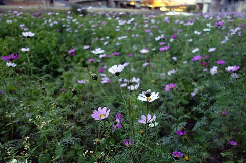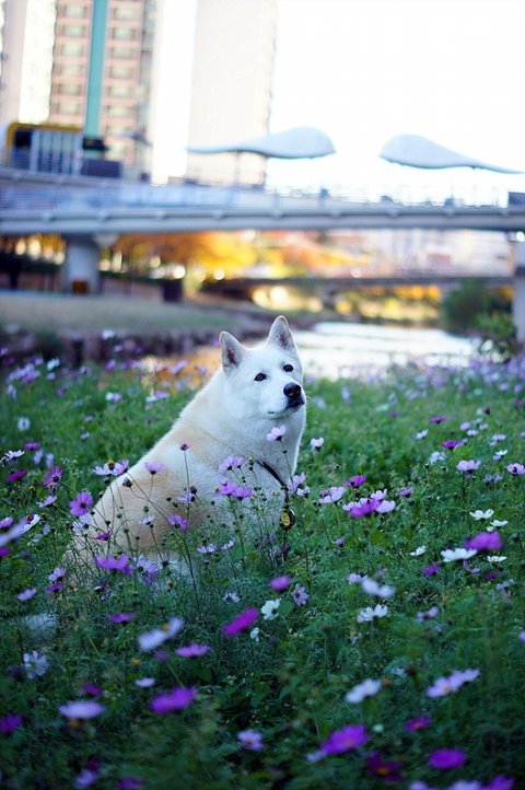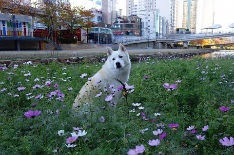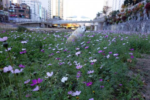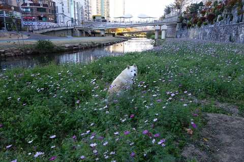 코스모스 사이로 물길이 있는데 그곳엔 풀이 없어. 앉아 시켜봤어요.