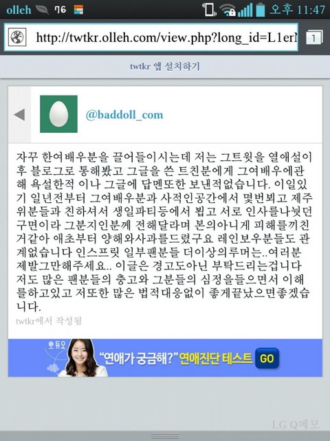 일단 여자가 '고소'얘기 하니까 어린 팬들 겁먹고 이제와서 너희를 이해한다, 잘 풀렸으면 좋겠다고 하니까 몇몇 인슾들 감동받은듯 ㅋㅋ 트위터 보면 저 여자분한테 죄송하다,잘못했다, 힘내시라 이런말 많음(물론 악플에 대해서 힘내라고 하는 사람도 많지만 약간 놀아나는 것 같은 느낌이 없지 않은듯;;하네요