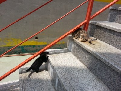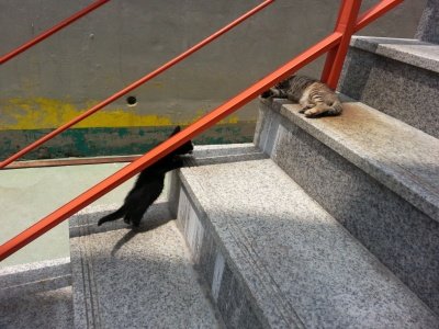 벽위도 타고 계단난간도 타고 옆 식당 마실도 갔다오고