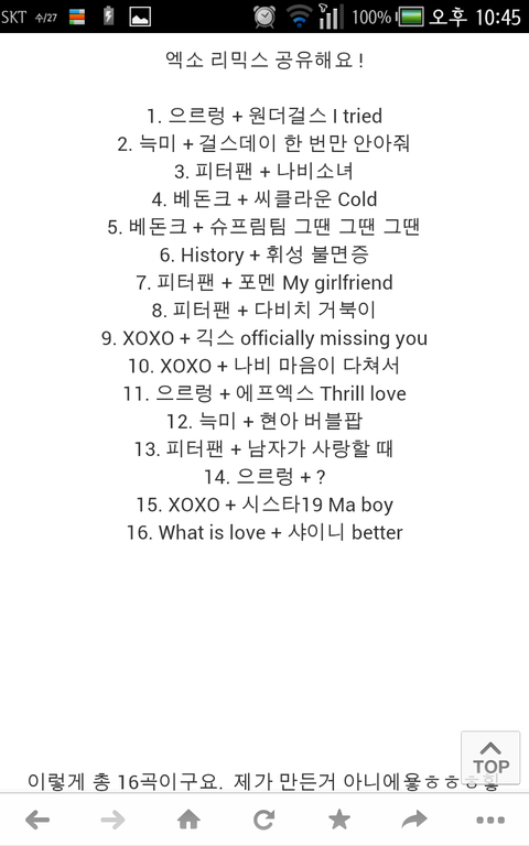 님들은 이거보고 기분 안나빠요? 비스트를 제외한 현아 지나언니 타가수 노래를 막 리믹스해서 이메일로 공유한다는게? 진짜 전 기분 니쁠꺼 같은데요 타가수 노래를 왜 그렇게 만들어 놓는지 도통 이해 안되네요. 엑소 리믹스 치면 비스트 나오구요ㅇ엑소팬분들 이런거 공유 받았음 삭제 부탁드려요 엄연히 저작권 침해 인거 아시죠. 제발 입장 바꿔서 생각좀.