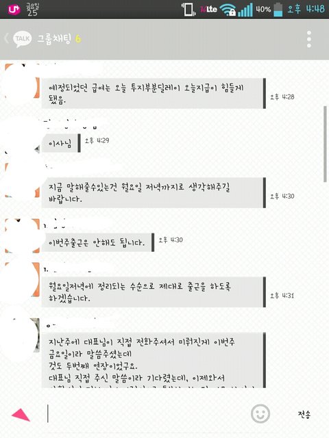 카톡으로 하는말이 오늘급여는 지급이 힘들게됐음.