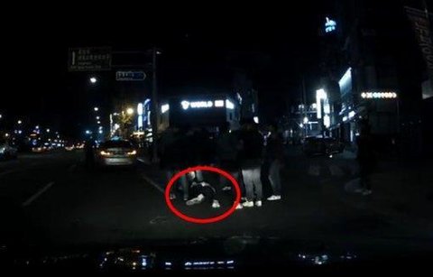 쓰러져있는 학생을 발로 차는모습