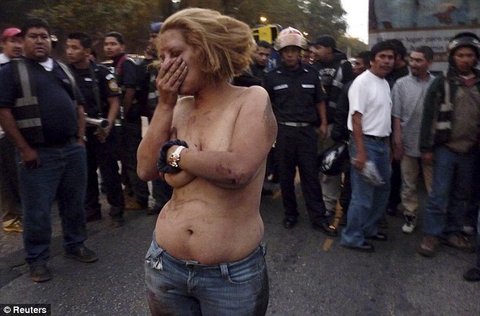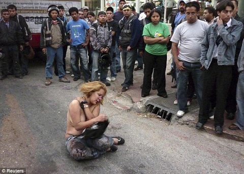 강도를 실패한 뒤 군중에게 붙잡힌 여자 강도가 거리에서 상의까지 벗겨진 채