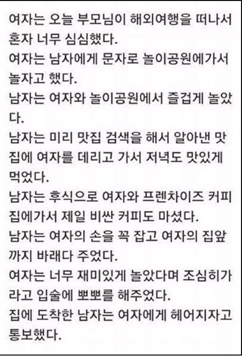 집까지 바래다 준 남자가 잘못아냐??? 같이 있을 생각이였으면.. 집에 가기전에 말하거나 끌고 들어가야지.... 아무리 부모님이 없어도 부모님과 같이 사는 집에서 같이 있을 생각을 한건가?? 남자가 이상한데 ㅡㅡ;;; 이 상황이면 여자가 헤어지자고 해야지 ㅋㅋㅋㅋㅋㅋ