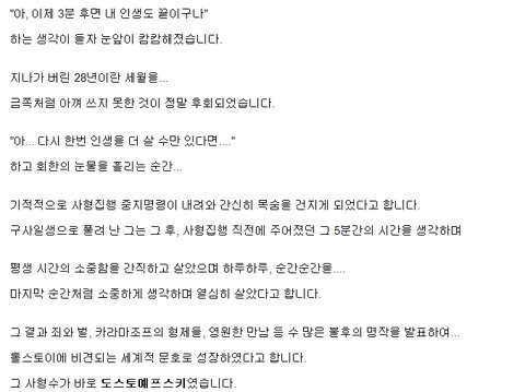 도스토예프스키가 왜 사형당할뻔 했냐면 '폐트라셰프스키'라는 모임이 공상적 사회주의를 기반으로 하는 모임이였는데 거기에 출입하면서 벨린스키가 고골에게 보낸 편지를 읽었다는 죄목으로 체포되어 사형선고를 받았고, 사형 집행 직전에 형이 감형되어서 10여 년간 감옥 생활 및 유형 생활을 했다고 합니다~