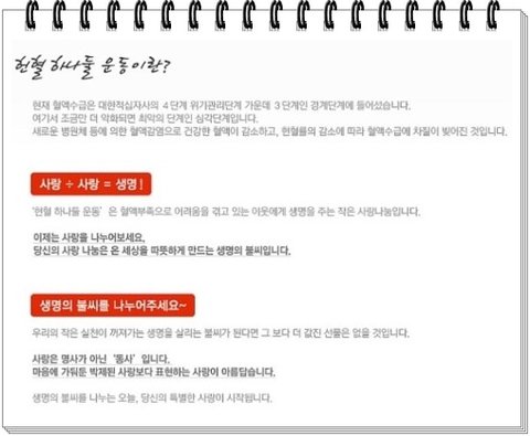 헌혈운동은 혈액부족으로 어려움을 겪는 이웃에게 생명을 주는 작은 사랑나눔이라고 되어 있습니다.