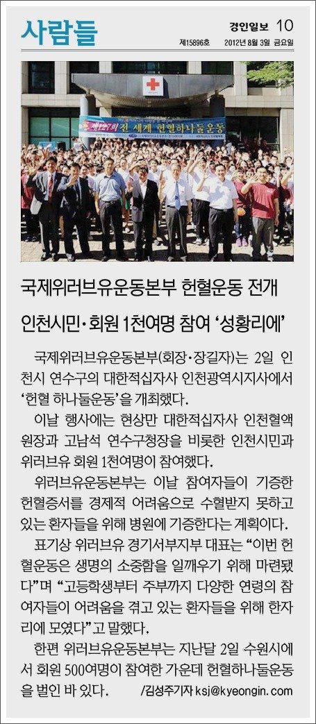 국제위러브유운동본부(회장 장길자)의 헌혈운동을 통해서