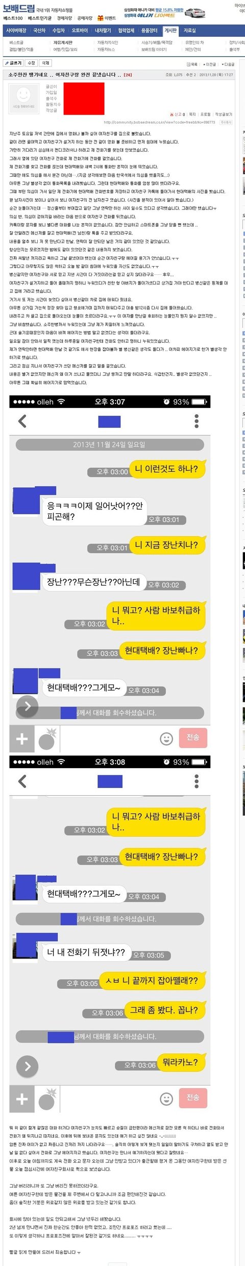 2년반 사귄 남녀커플인데 여친이 현대택배남과 만나다 걸려 헤어진 이야기.
