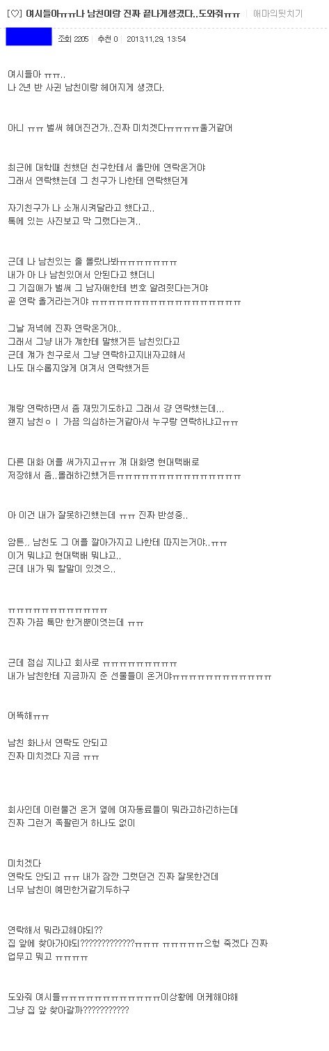 어제 28일 남자가 보배에 여친과 헤어져서 힘들다는 이야기 올림.