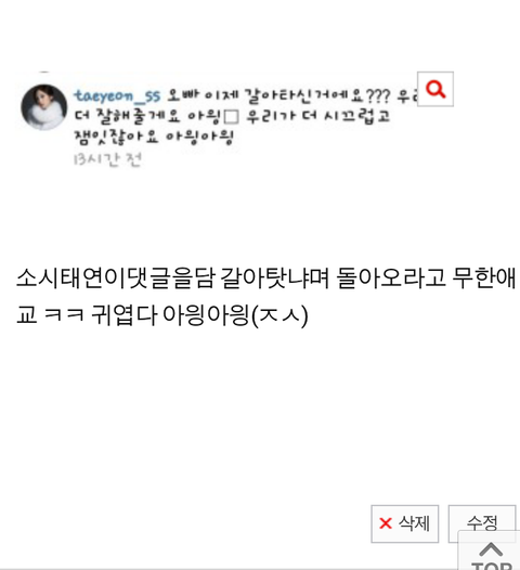 태연댓글사진잘보면알겟지만 태연프사위에약간 검은부분있음 내가캡쳐해서 자르기 하다가 대충해사 저런건데 보니.내껄복사해갓군
