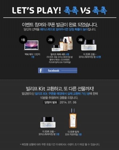 2등은 빌리프 촉촉세트 6명, 3등은 더 트루 크림 모이스춰라이징 밤 60명 입니다!