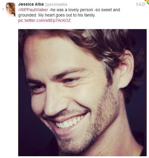 “he was a lovely person -so sweet and grounded. My heart goes out to his family. 폴워커는 정말 사랑스럽고 매력있는 사람이었다. 사망으로 인해 고통을 겪고 있을 그의 가족에게 위로를 건네주고 싶다”