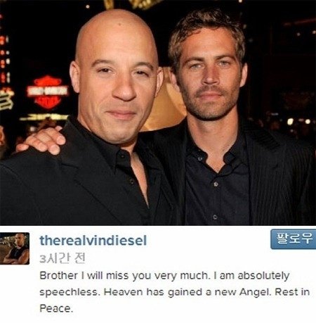 동료 배우이자 절진인 빈디젤도 sns에 애도를 표했어요..