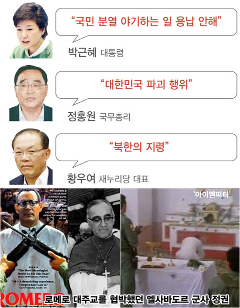 박근혜 대통령은 천주교 정의구현사제단의 '시국미사'를 <국민 분열을 야기하는 일>이라고 했습니다. 정홍원 총리는 <대한민국을 파괴하는 행위>라고 황우여 새누리당 대표는 <북한의 지령>이라고까지 운운했습니다.
